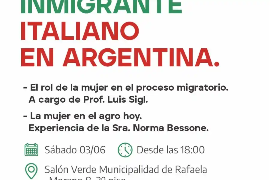 En este marco, ese sábado se brindará una charla en el Salón Verde del municipio a las 18:00. El eje temático abordará el rol de la mujer italiana en el proceso inmigratorio en Rafaela, a cargo del profesor Luis Sigl. Además, se contará la experiencia actual de quien preside la Sociedad Rural de Rafaela, Norma Bessone.