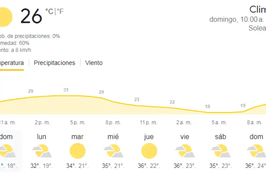A media mañana y, según los datos brindados por el Servicio Meteorológico Nacional, la temperatura actual ronda los 26 °C, con una humedad en el ambiente del 60%.