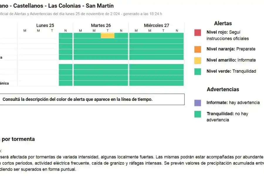 Este aviso, válido únicamente para la tarde del martes 26 de noviembre, advierte sobre la posible llegada de tormentas fuertes que podrían afectar a la región con fenómenos meteorológicos intensos. Específicamente involucra los departamentos Belgrano - Castellanos - Las Colonias - San Martín - Garay - La Capital - San Jerónimo - Brand Nueve de Julio - San Cristóbal - San Justo - General Obligado - San Javier – Vera.