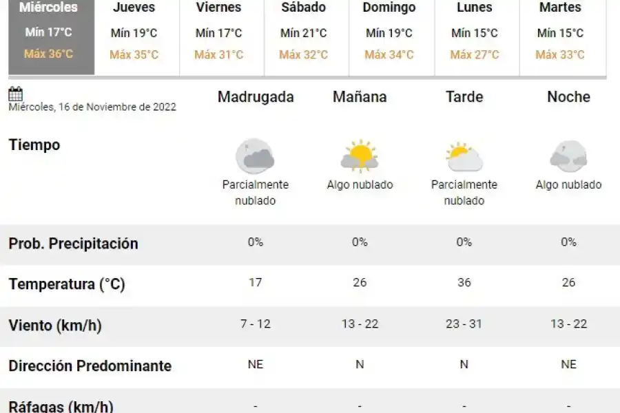 El parte del servicio meteorológico prevé que para después del mediodía el cielo estará algo nublado y los vientos del sector norte tendrán velocidades estimadas entre 23 y 31km/h. La temperatura pronosticada sería de 35 grados.