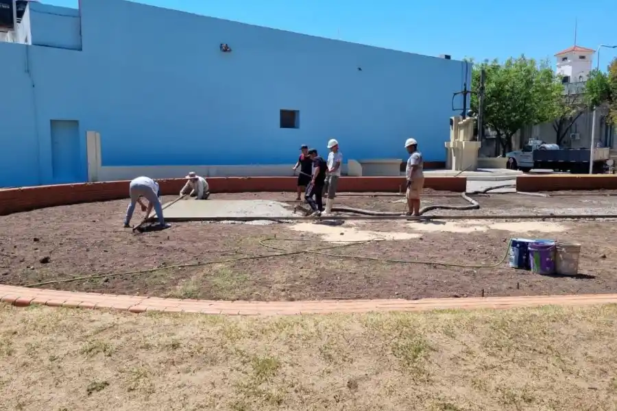 Continúan las tareas para la puesta en valor y renovación del espacio verde. Esta semana se está realizando la construcción de la platea para pisos antigolpes en el espacio mayor del anterior arenero, para la posterior instalación de juegos.