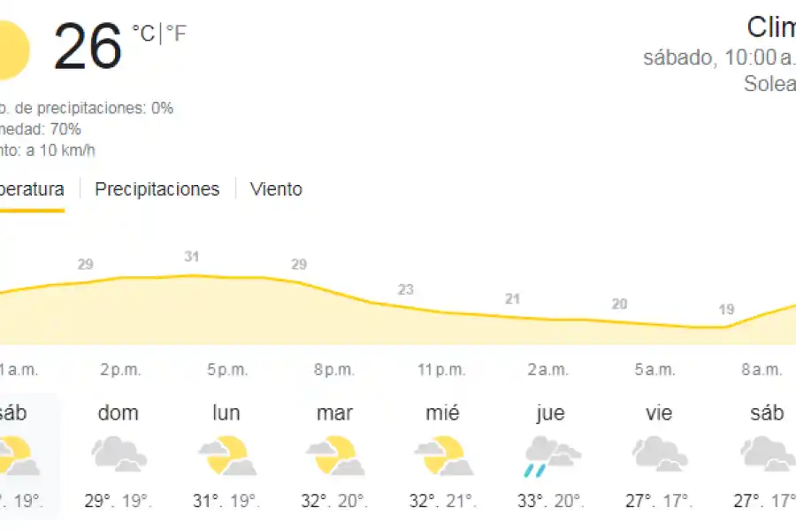 Con una temperatura a media mañana de 26 ºC, tendremos un día soleado en dónde la mínima rondará los 19 ºC y el tope de temperatura llegará a los 31 ºC. Más detalles acá.