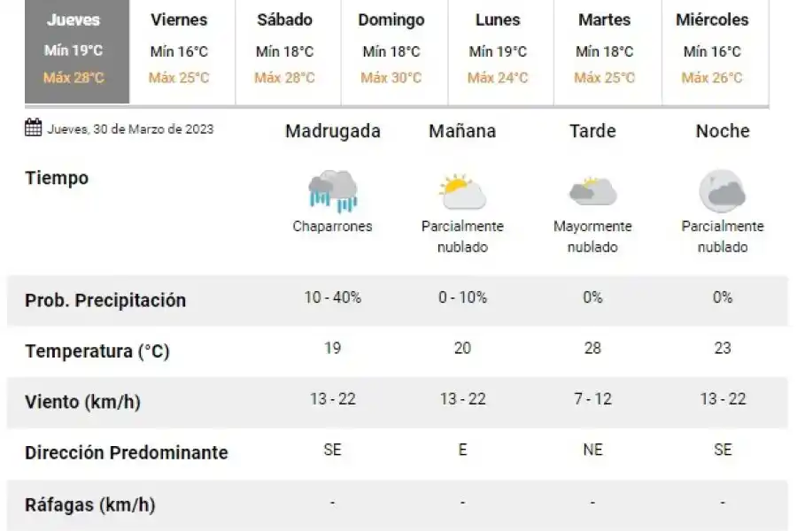 El Servicio Meteorológico Nacional anticipa que este jueves 30 de marzo, la temperatura rondará entre 19 y 28 grados; la probabilidad de lluvias alcanzará el 40 por ciento en Rafaela.