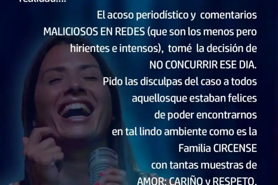 “El acoso periodístico y comentarios MALICIOSOS EN REDES (que son los menos pero hirientes e intensos), tomé la decisión de NO CONCURRIR ESE DIA. Pido las disculpas del caso a todos aquellos que estaban felices de poder encontrarnos en tal lindo ambiente como es la Familia CIRCENSE con tantas muestras de AMOR; CARIÑO Y RESPETO”, indicó.