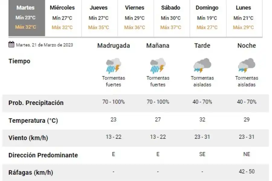 El Servicio Meteorológico Nacional anticipa que este martes 21 de marzo, la temperatura rondará entre 23 y 32; la probabilidad de lluvias alcanzará el 40 y 70 por ciento en Rafaela.