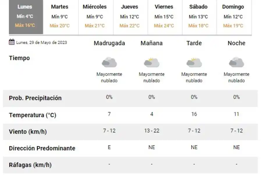 El Servicio Meteorológico Nacional anticipa que este lunes 29 de mayo, la temperatura rondará entre 4 y 16; descartan lluvias durante la jornada en Rafaela.