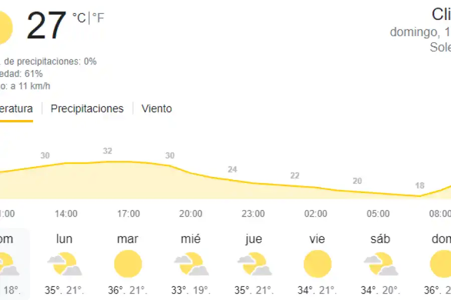 Con una temperatura que ronda los 18 ºC de mínima y los 32 ºC de máxima, la sensación es que tendremos una jornada calurosa de domingo e incluso puede que, por la tarde, lleguen las precipitaciones. Todos los datos del clima los encontrás acá.