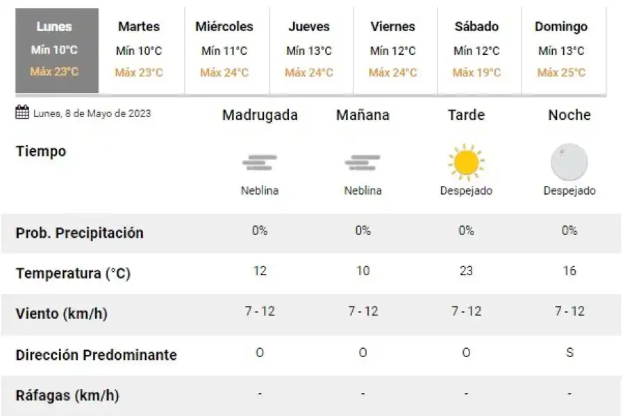 El parte del servicio meteorológico prevé que para después del mediodía el cielo estará despejado y los vientos del sector oeste tendrán velocidades estimadas entre 7 y 12km/h. La temperatura pronosticada sería de 23 grados.