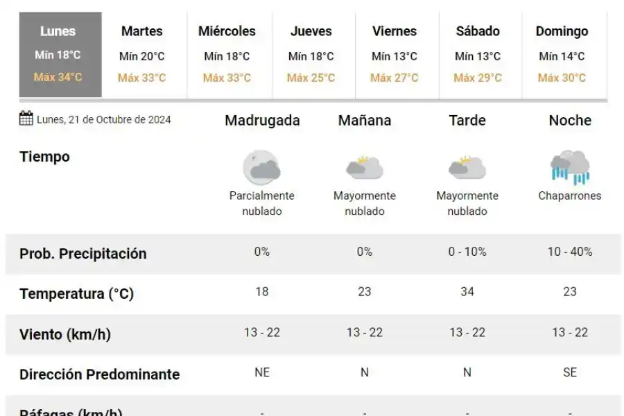 El Servicio Meteorológico Nacional anticipa que este lunes 21 de octubre, la temperatura rondará entre 18 y 34.
