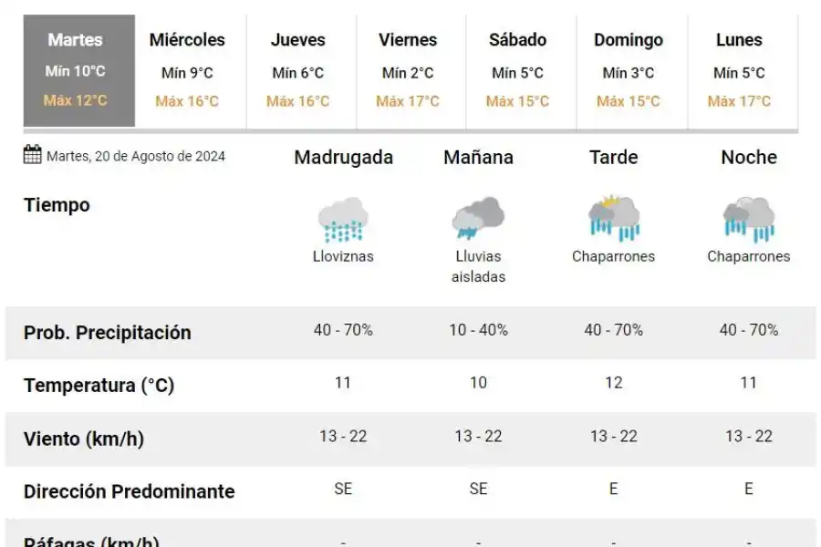 El parte del servicio meteorológico prevé que para después del mediodía el cielo estará con chaparrones y los vientos del sector este tendrán velocidades estimadas entre 13 y 22 km/h. La temperatura pronosticada sería de 12 grados.
