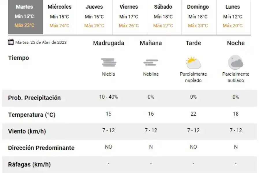 El Servicio Meteorológico Nacional anticipa que este martes 25 de abril, la temperatura rondará entre 15 y 22; descartan lluvias durante la jornada en Rafaela.