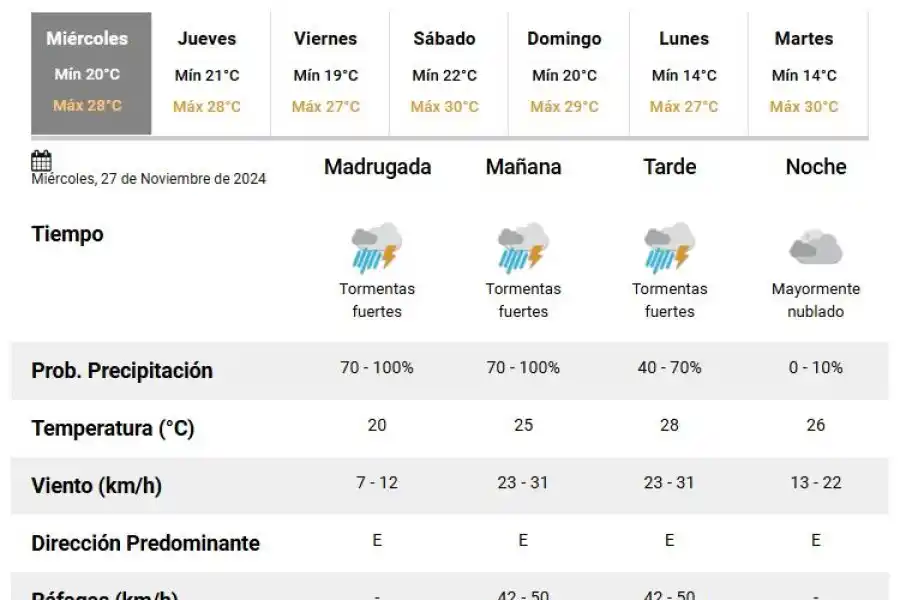 De acuerdo al parte del Servicio Meteorológico Nacional, el clima se presentaría con "tormentas fuertes" para toda la mañana, y los vientos del este correrán a una velocidad de entre 23 y 31 kilómetros por hora. La humedad sería del 98 por ciento, y la visibilidad sería muy mala.