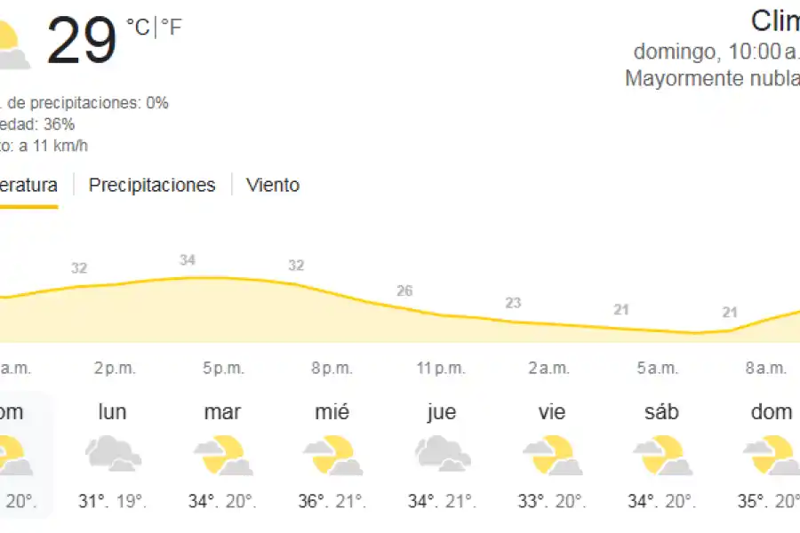 Según el pronóstico del Servicio Meteorológico Nacional (SMN), la temperatura oscilará entre 20 ºC de mínima y 34 ºC de máxima.