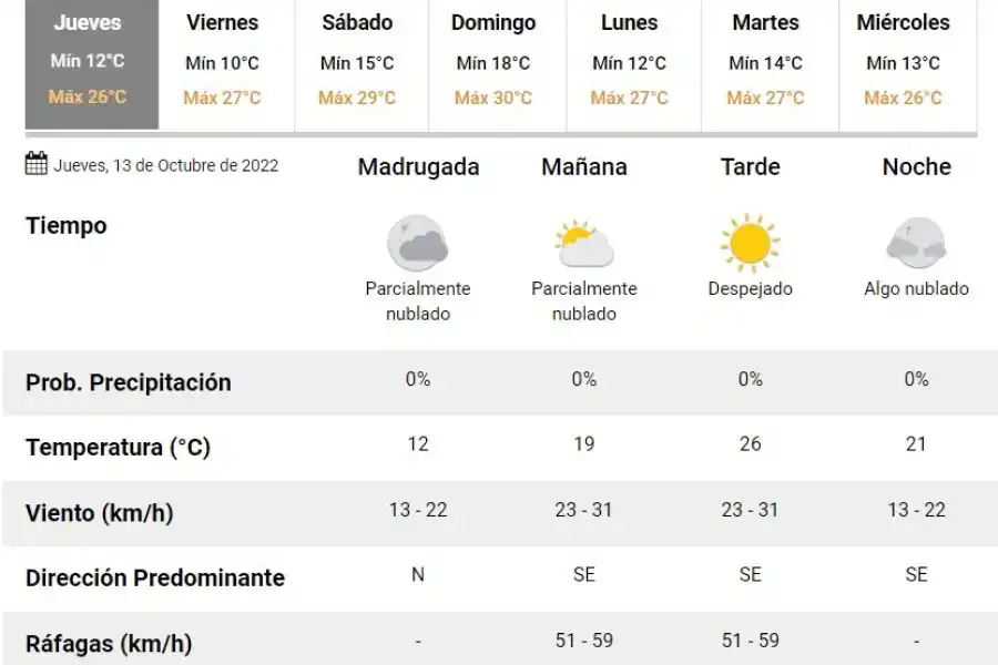 El Servicio Meteorológico Nacional anticipa que este jueves 13 de octubre, la temperatura rondará entre 12 y 22 grados; descartan lluvias durante la jornada en Rafaela.