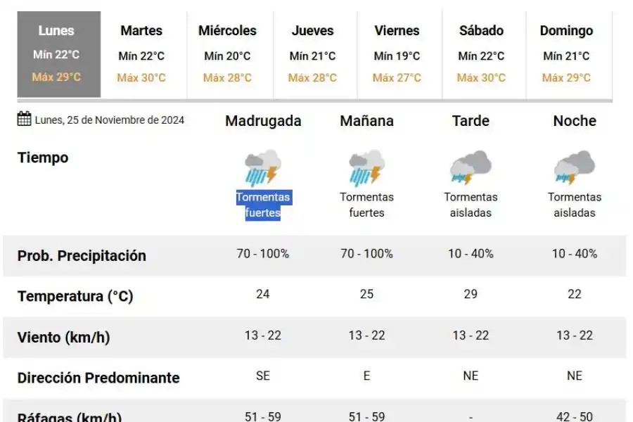 A la noche, el clima rondará los 22 grados, mientras que los vientos serán del noreste a una velocidad de 13 y 22 kilómetros por hora. Para esta franja horaria, el SMN indica la presencia de tormentas aisladas.
