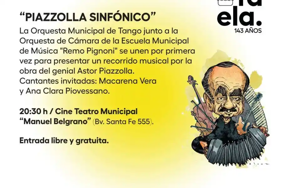 La Escuela Municipal de Música “Remo Pignoni” y la Orquesta Municipal de Tango presentan un espectacular homenaje a Astor Piazzolla el próximo 23 de octubre, con entrada libre y gratuita. Música, talento y emoción para celebrar juntos el aniversario de nuestra ciudad.