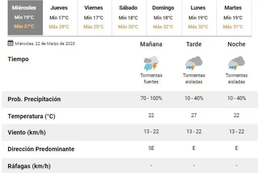El Servicio Meteorológico Nacional anticipa que este miércoles 22 de marzo, la temperatura rondará entre 19 y 27; la probabilidad de lluvias alcanzará el 40 y 70 por ciento en Rafaela.
