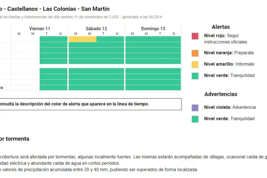 "El área de cobertura será afectada por tormentas, algunas localmente fuertes. Las mismas estarán acompañadas de ráfagas, ocasional caída de granizo, fuerte actividad eléctrica y abundante caída de agua en cortos períodos. Se esperan valores de precipitación acumulada entre 20 y 40 mm, pudiendo ser superados de forma localizada"