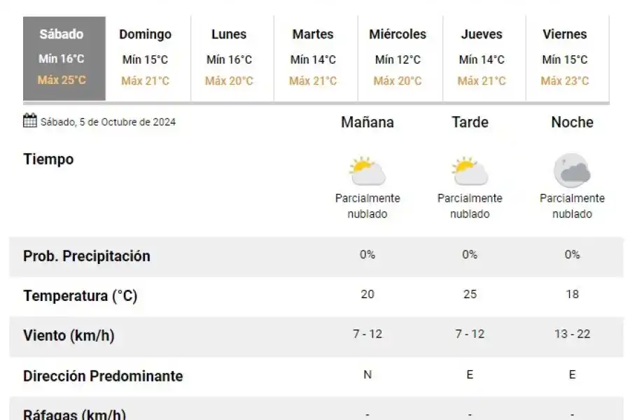 El Servicio Meteorológico Nacional anticipa que este sábado 5 de octubre, la temperatura rondará entre 16 y 32; se descartan lluvias durante la jornada.