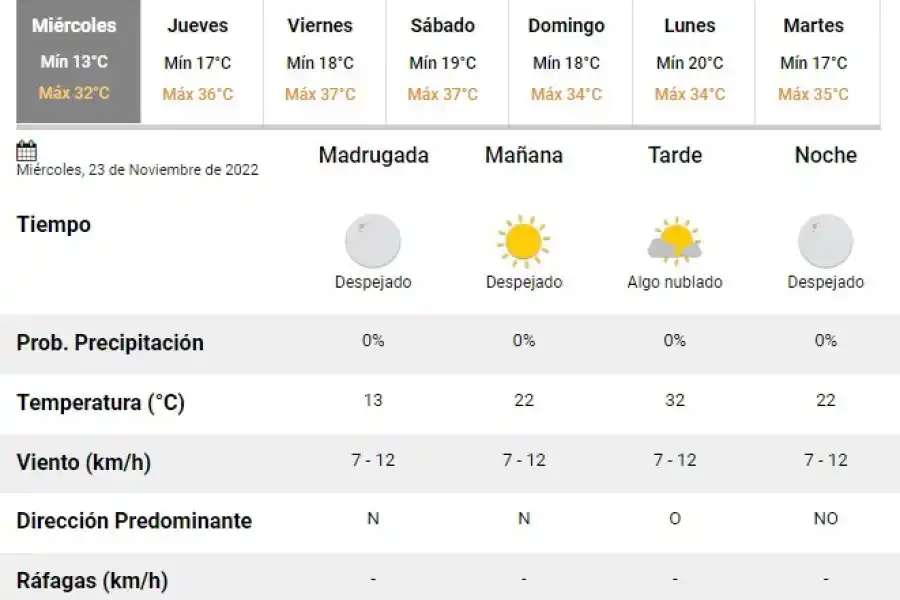 El Servicio Meteorológico Nacional anticipa que este miércoles 23 de noviembre, la temperatura rondará entre 14 y 34; descartan lluvias durante la jornada en Rafaela.