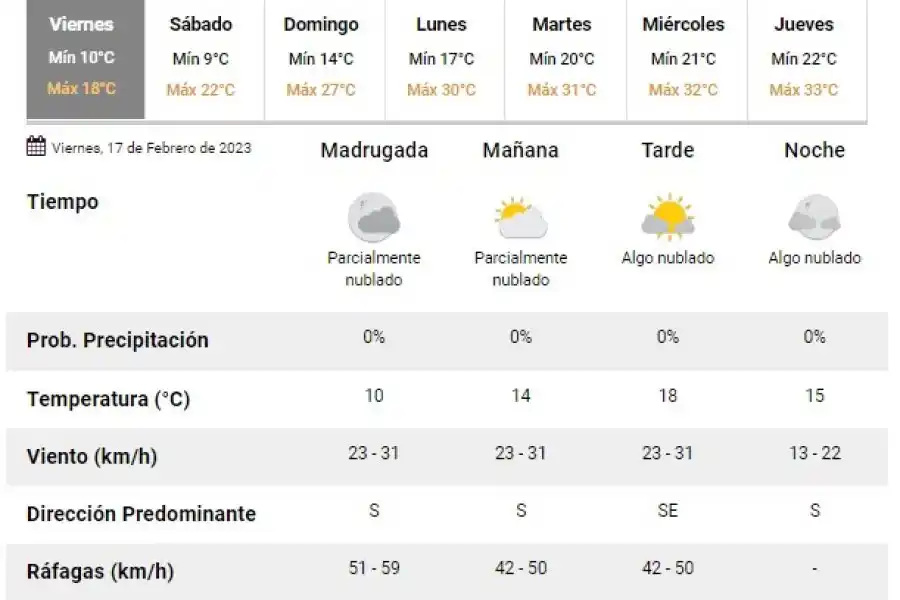 El Servicio Meteorológico Nacional anticipa que este viernes 17 de febrero, la temperatura rondará entre 10 y 18; descartan lluvias durante la jornada en Rafaela.