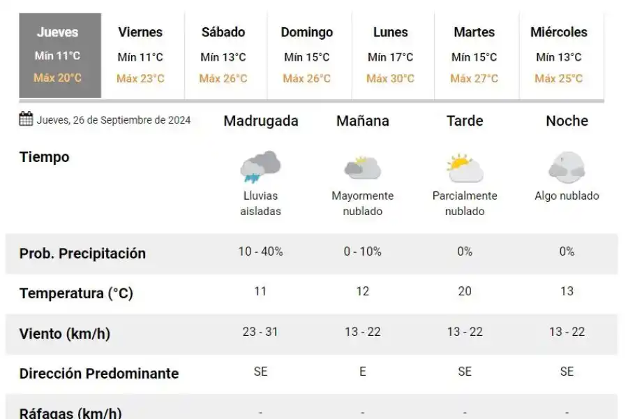 A la noche, el clima rondará los 17 grados, mientras que los vientos serán del este a una velocidad de 7 y 12 kilómetros por hora. No se esperan lluvias para esta franja del día.