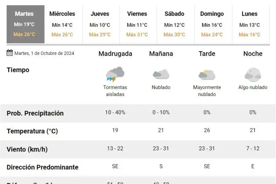 El parte del servicio meteorológico prevé que para después del mediodía el cielo estará mayormente nublado y los vientos del sector sudeste tendrán velocidades estimadas entre 23 y 31 km/h. La temperatura pronosticada sería de 26 grados.