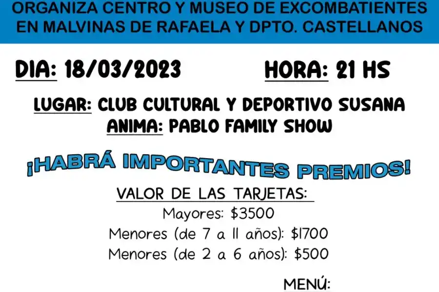 Será el sábado 18 de marzo, con tarjetas a la venta. La misma tendrá lugar en el Club Cultural y Deportivo Susana, desde las 21 horas. Contará con la animación músical de Pablo Family Show.