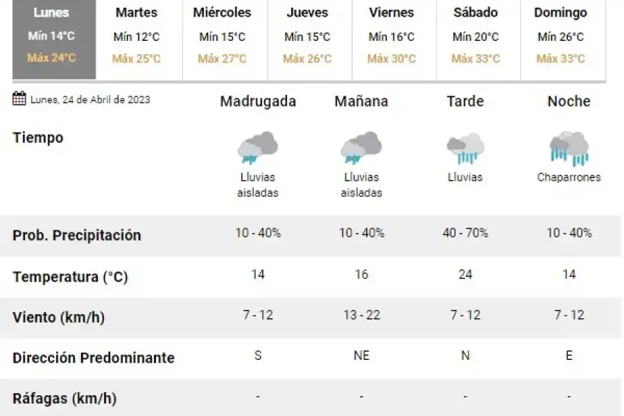 El Servicio Meteorológico Nacional anticipa que este lunes 24 de abril, la temperatura rondará entre 14 y 24; la probabilidad de lluvias alcanzará el 10 y 40 por ciento en Rafaela