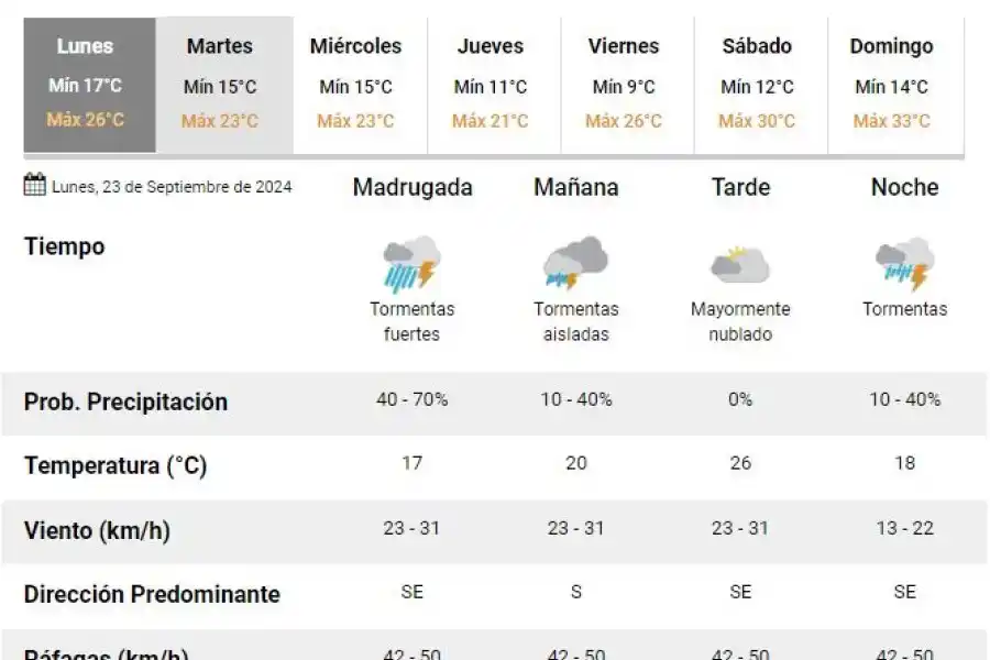 De acuerdo al parte del Servicio Meteorológico Nacional, el clima se presentaría sin lluvias, y los vientos del sur correrán a una velocidad de entre 23 y 31 kilómetros por hora. La humedad sería del 65 por ciento, y la visibilidad sería regular.