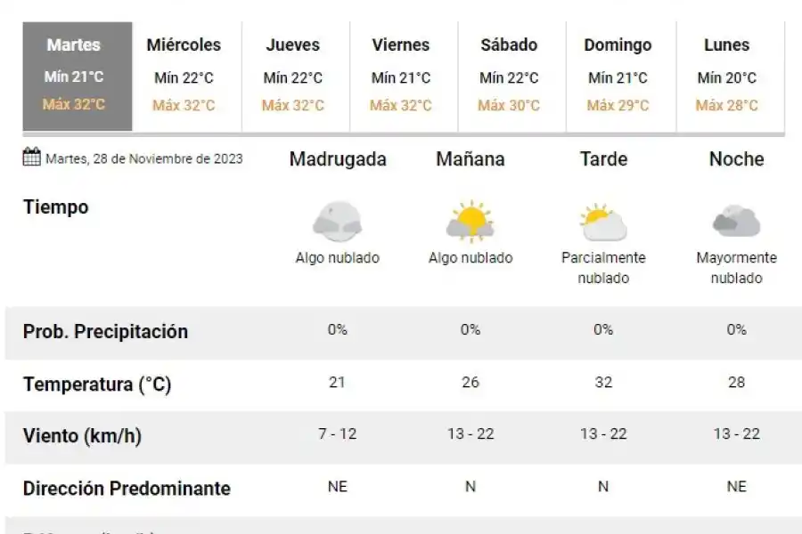 El parte del servicio meteorológico prevé que para después del mediodía el cielo estará parcialmente nublado y los vientos del sector norte tendrán velocidades estimadas entre 13 y 22km/h. La temperatura pronosticada sería de 32 grados.