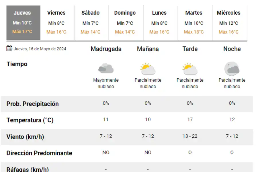 El Servicio Meteorológico Nacional anticipa que este jueves 16 de mayo, la temperatura rondará entre 5 y 19; descartan lluvias durante la jornada en Rafaela.