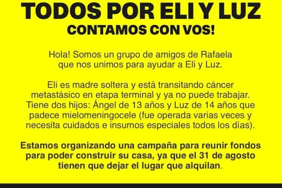 Por si fuera poco, a toda la complejidad de su vida se le suma a que a corto plazo deben dejar la vivienda que están alquilando. En este sentido, un grupo de rafaelinos optaron por comenzar una campaña solidaria para ayudar a la familia. Organizaron una pollada a beneficio para juntar fondos y comprar materiales para construir su casa.