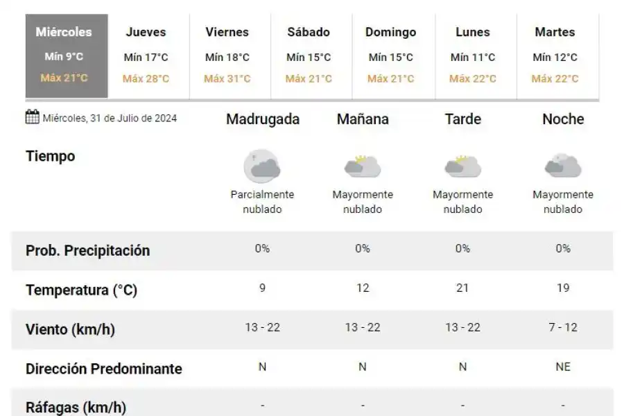 A la noche, el clima rondará los 19 grados, mientras que los vientos serán del noreste a una velocidad de 7 y 12 kilómetros por hora. No se esperan lluvias para esta franja del día.