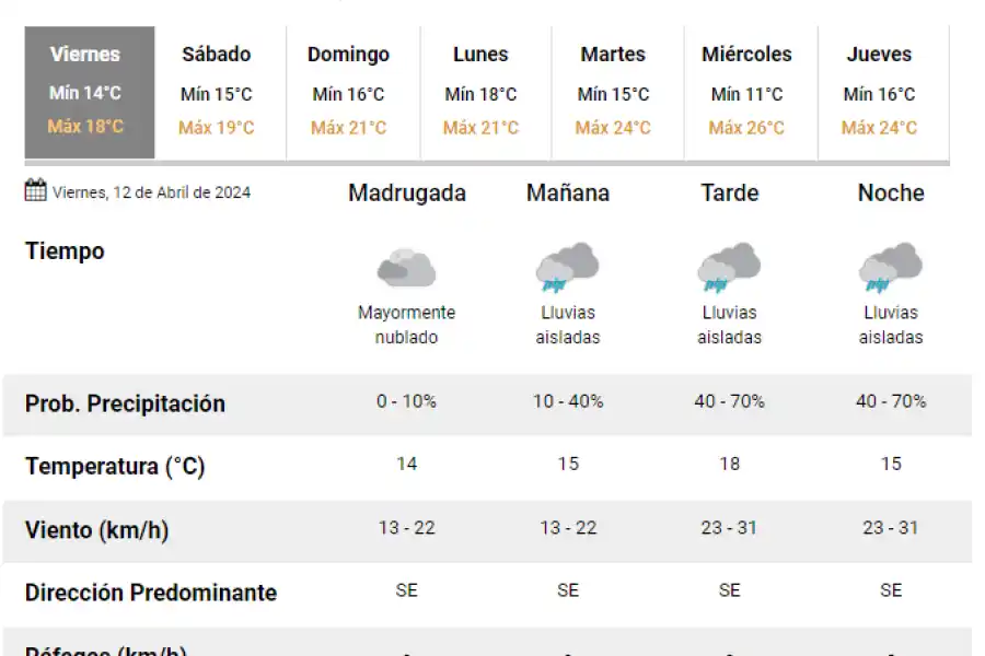 El Servicio Meteorológico Nacional anticipa que este viernes 12 de abril, la temperatura rondará entre 14 y 18; la probabilidad de lluvias alcanzará el 10 y 40 por ciento en Rafaela.