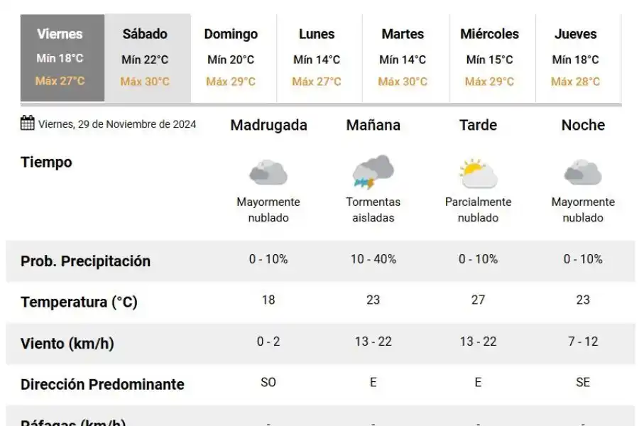 A la noche, el clima rondará los 25 grados, mientras que los vientos serán del este a una velocidad de 13 y 22 kilómetros por hora. No se esperan lluvias para esta franja del día.