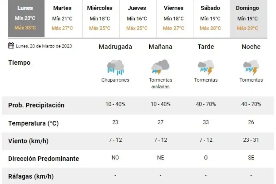 El Servicio Meteorológico Nacional anticipa que este lunes 20 de marzo, la temperatura rondará entre 23 y 33; la probabilidad de lluvias alcanzará el 10 y 40 por ciento en Rafaela.