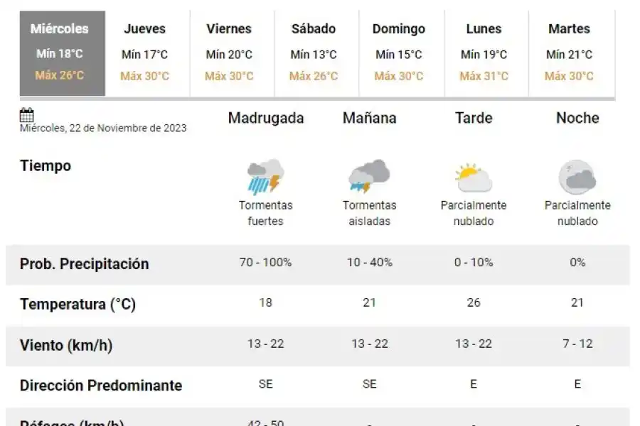 De acuerdo al parte Servicio Meteorológico Nacional, el clima presenta una probabilidad de lluvia de entre 70 y 100 por ciento, y los vientos del sudeste correrán a una velocidad de entre 13 y 22 kilómetros por hora. La humedad sería del 100 por ciento.