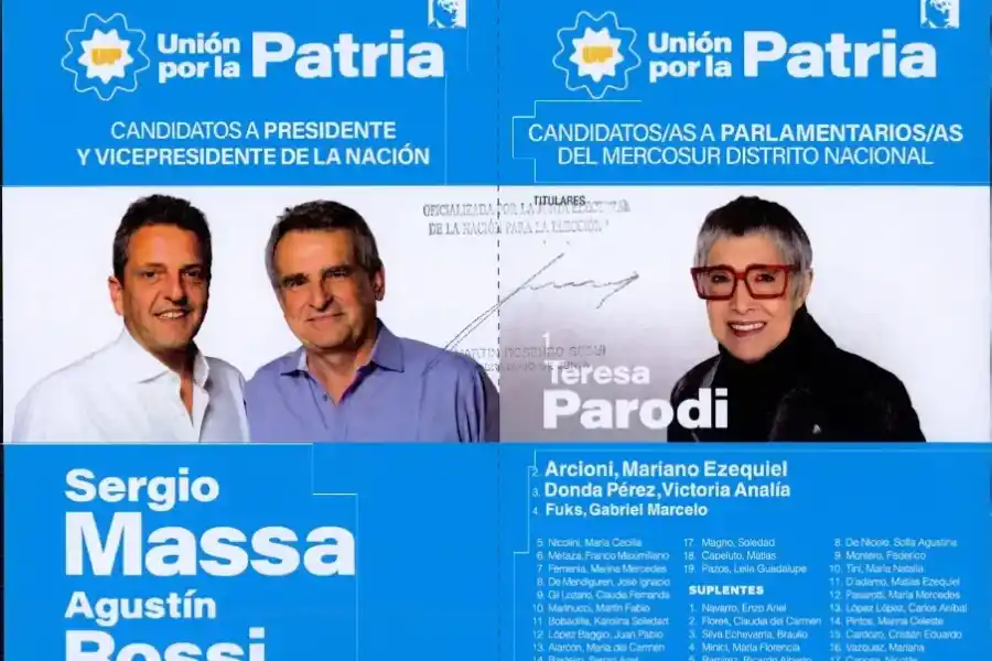 Unión por la Patria también decidió cambiar las fotos de su candidato presidencial, Massa, y a vicepresidente, Rossi, quienes para esta nueva boleta lucen más desacartonados, vistiendo simplemente camisa (el tigrense, blanca; el santafesino, celeste): en la papeleta de las PASO ambos usaron traje para el retrato. También hubo modificaciones en el diseño: se invirtieron algunos colores y se ubicó más arriba las figuras de Perón, Evita y Néstor Kirchner.