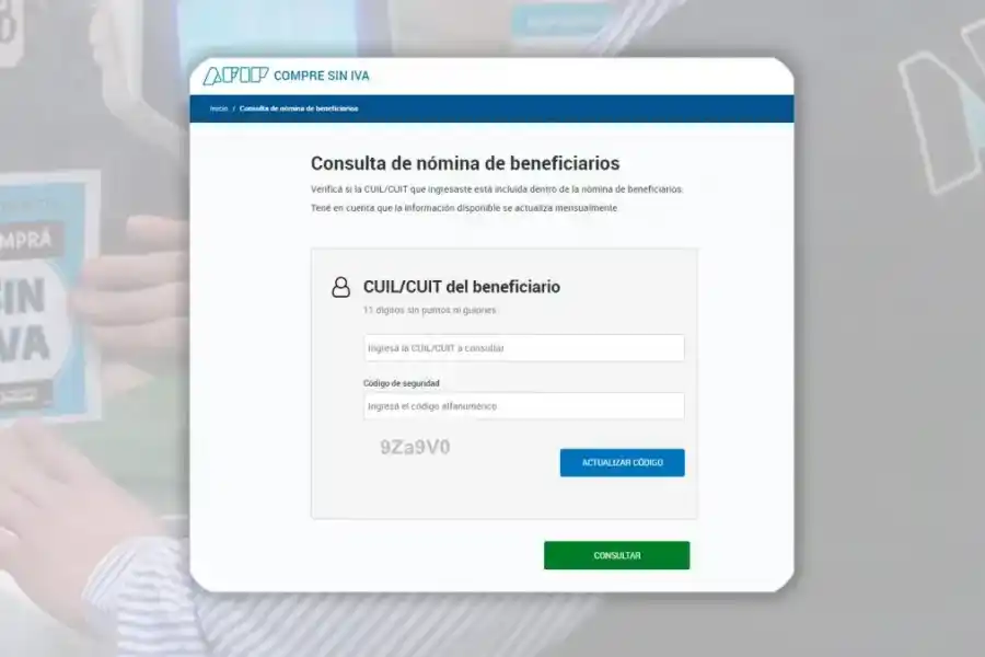 La Administración Nacional de Ingresos Públicos (AFIP) lanzó un sitio en el que las personas pueden consultar si están incluidas como beneficiarias del programa Compre sin IVA, que reintegra el impuesto a las compras de canasta básica con tarjeta de débito.