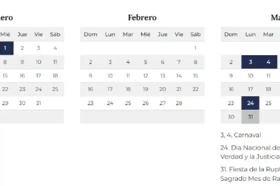 Lunes 3 y martes 4: Carnaval (feriados inamovibles).