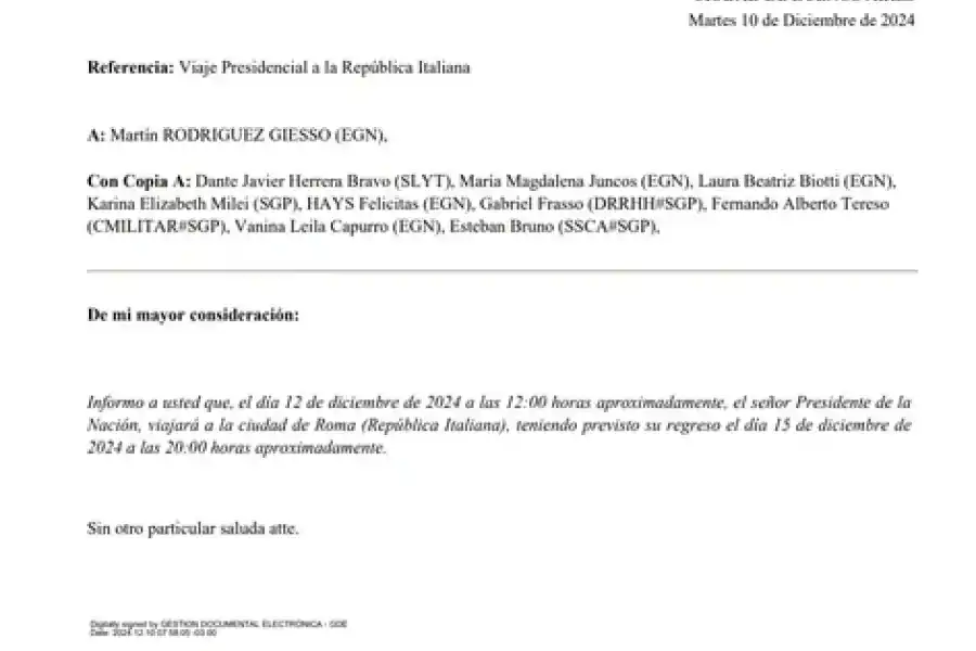 “Informo a usted que, el día 12 de diciembre de 2024 a las 12:00 horas aproximadamente, el señor Presidente de la Nación, viajará a la ciudad de Roma (República Italiana), teniendo previsto su regreso el día 15 de diciembre de 2024 a las 20:00 horas aproximadamente”, se le notificó a la funcionaria y a sus colaboradores a través del documento.
