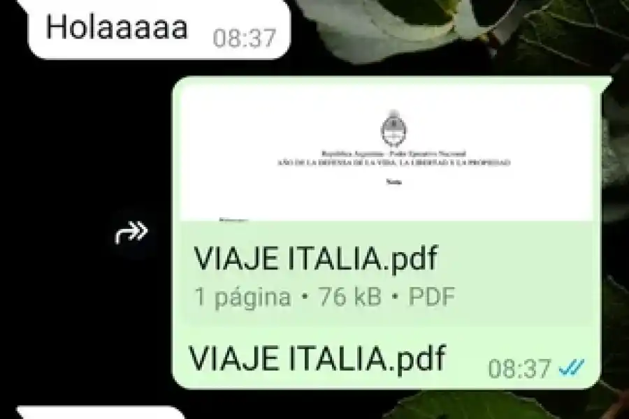 Incluso, difundieron un chat con la secretaria privada de la vicepresidenta, Guadalupe Jones, a quien se le hizo extensivo el documento en formado PDF de la Casa Militar notificando días y horarios, bajo el nombre “Viaje a Italia”. Jones dio confirmación de recepción con dos “ok” a las 8.37 del día martes.