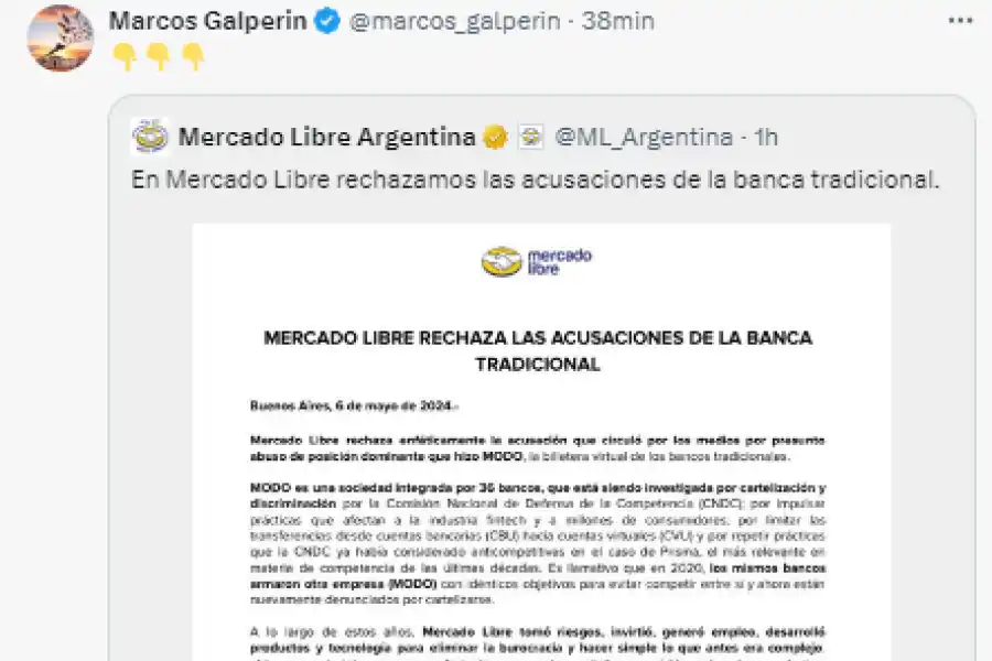 Por la noche, Mercado Libre emitió un comunicado rechazando todas las acusaciones y asegurando que la propia Modo estaba siendo investigada por cartelización en la misma CNDC.