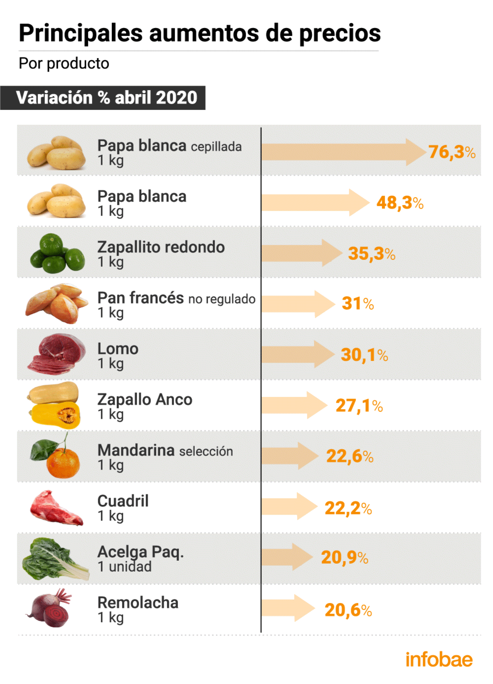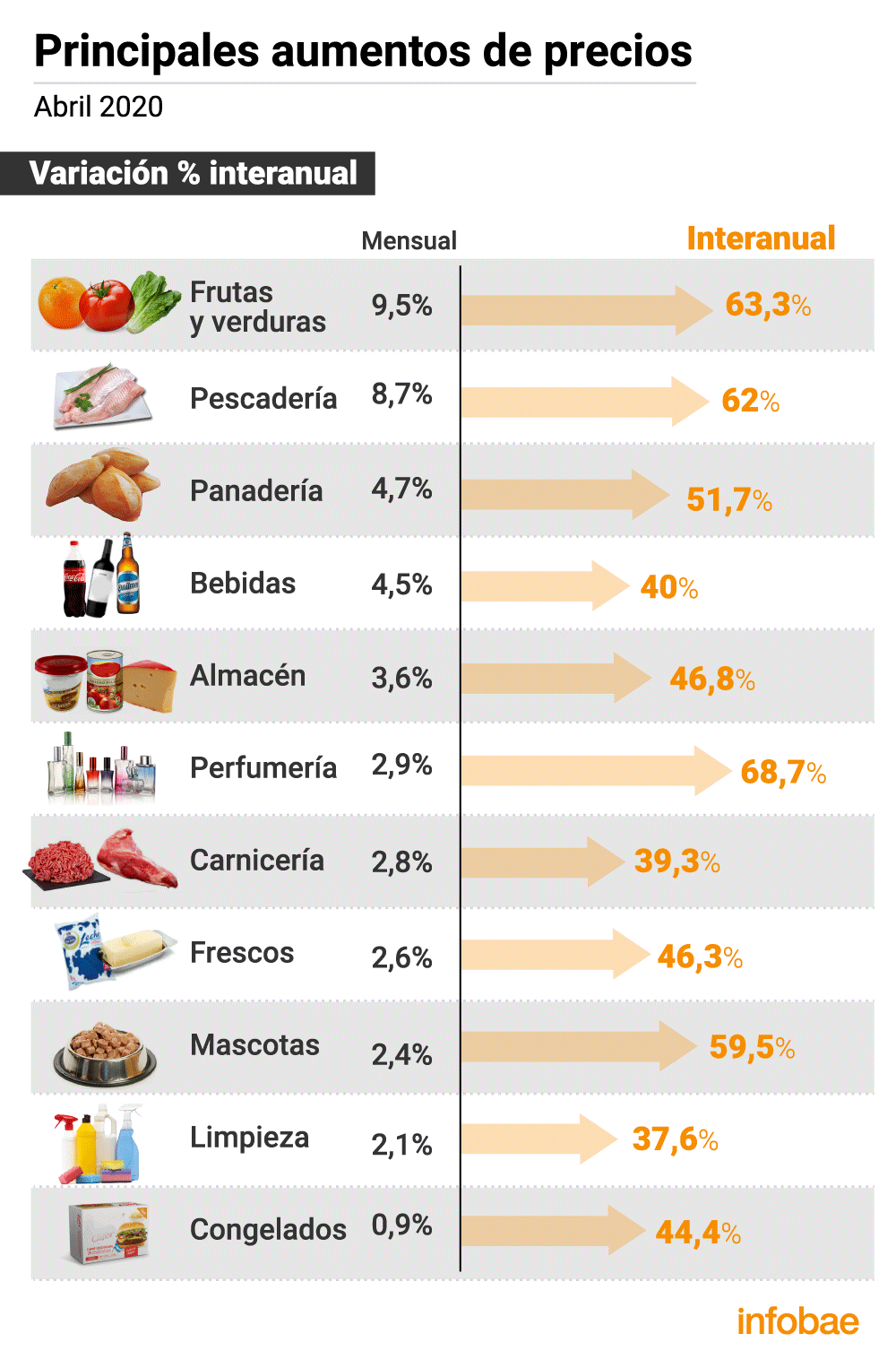 Un estudio de la consultora Tomadato que revela 22.000 precios de forma quincenal en 13 bocas de súper e hipermercados ubicados en Capital Federal y Gran Buenos Aires detectó que la variación promedio mensual de estos ítems en abril fue de 3,3% y acumularon en los primeros cuatro meses del año 12% de incremento. Entre los rubros con mayor incremento se encuentran frutas y verduras (9,5%); pescadería (8,7%); y panadería (4,7%), con grandes aumentos en la papa blanca cepillada, el zapallito redondo y el pan francés.
