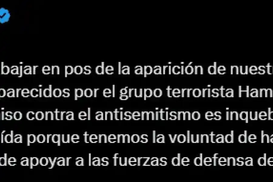 Por esto, manifestó: "Mi prioridad es trabajar en pos de la aparición de nuestros compatriotas (y todos) los desaparecidos por el grupo terrorista Hamás".