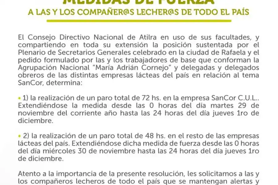 - La realización de un paro total de 72 hs. en la empresa SanCor C.U.L.. Extendiéndose la medida desde las 0 horas del día martes 29 de noviembre del corriente año hasta las 24 horas del día jueves 1ro de diciembre.