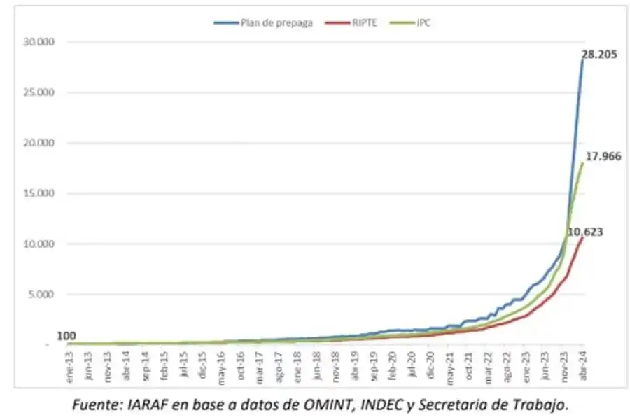 El trabajo analizó tres variables durante el periodo enero 2013-abril 2024: el aumento de los precios que realizaron las empresas, el dato de inflación medido por el IPC y la evolución del salario. El informe de IARAF demostró en ese lapso, los planes de salud prepagos tuvieron un incremento del 28.105%, por debajo de la inflación general que trepó un 17.866% y el salario promedio 10.523%.