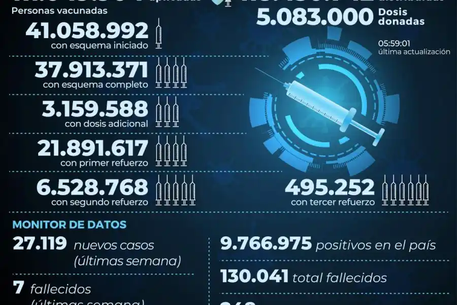 Según el Monitor Público de Vacunación, el total de dosis aplicadas asciende a 111.049.904, de los cuales 41.058.992 recibieron una dosis, 37.913.371 las dos, 3.159.588 una adicional, 21.891.617 el primer refuerzo, 6.528.768 el segundo, y 495.252 el tercer, mientras que las vacunas distribuidas a las jurisdicciones llegan a 118.430.742 y las donadas a 5.083.000.
