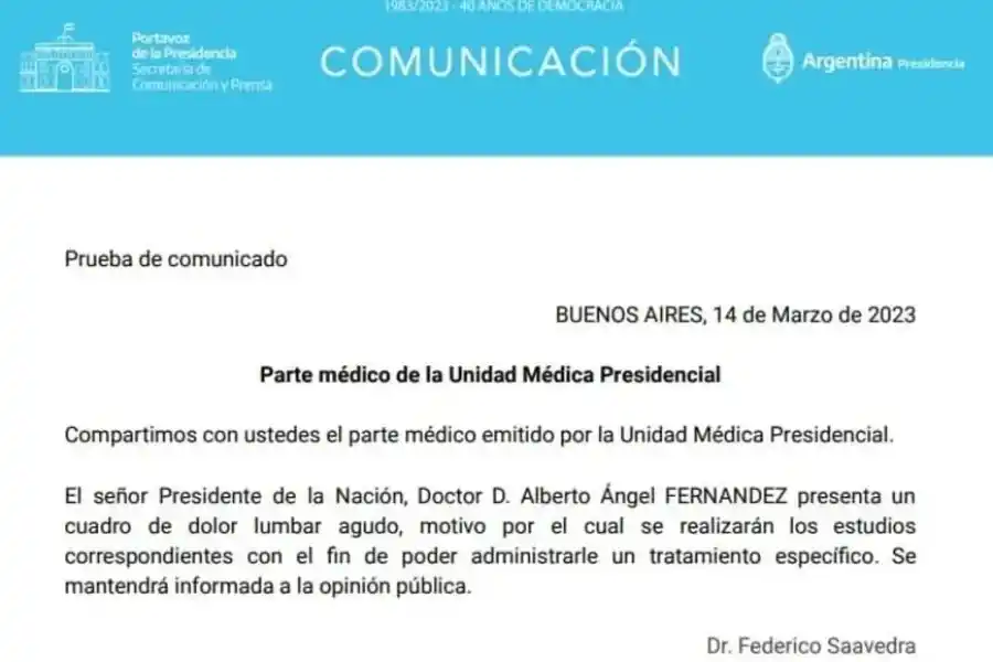 "El Presidente presenta un cuadro de dolor lumbar agudo, motivo por el cual se realizarán los estudios correspondientes con el fin de poder administrarle un tratamiento específico. Se mantendrá informada a la opinión pública", consignó el parte oficial firmado por el médico Federico Saavedra.
